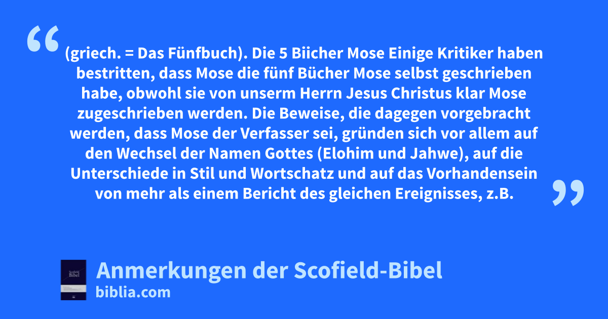 Einige Kritiker haben bestritten, dass Mose die fünf Bücher Mose selbst geschrieben habe, obwohl sie von unserm Herrn Jesus Christus klar Mose zugeschrieben werden. Die Beweise, die dagegen vorgebracht werden, dass Mose der Verfasser sei, gründen sich vor allem auf den Wechsel der Namen Gottes (Elohim und Jahwe), auf die Unterschiede in Stil und Wortschatz und auf das Vorhandensein von mehr als einem Bericht des gleichen Ereignisses, z.B. die Erschaffung des Menschen in 1. Mose 1,26 und 2,7.