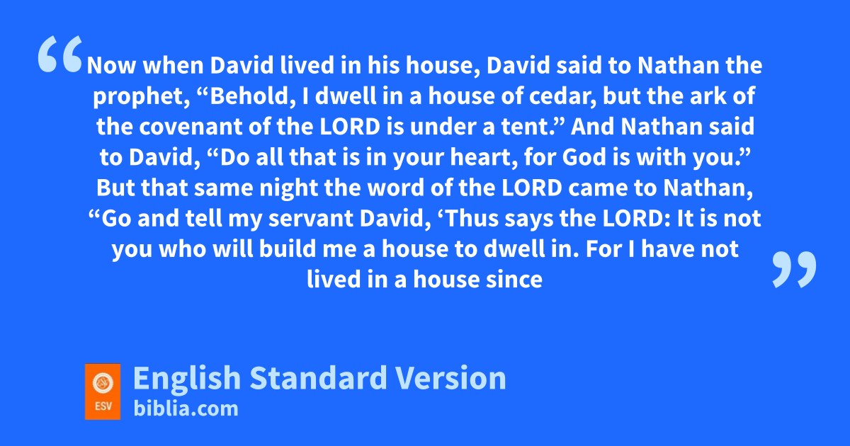 17 tNow when David lived in his house, David said to Nathan the prophet, “Behold, I dwell in a house of cedar, but the ark of the covenant of the Lord is under a tent.” 2 And Nathan said to David, “Do all that is in your heart, for God is with you.”