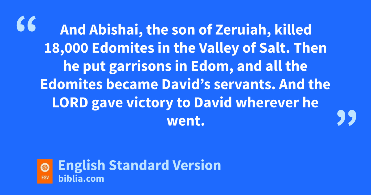 12 And kAbishai, the son of Zeruiah, killed 18,000 Edomites in the Valley of Salt. 13 Then he put garrisons in Edom, and all the Edomites became David’s servants. And the Lord gave victory to David wherever he went.