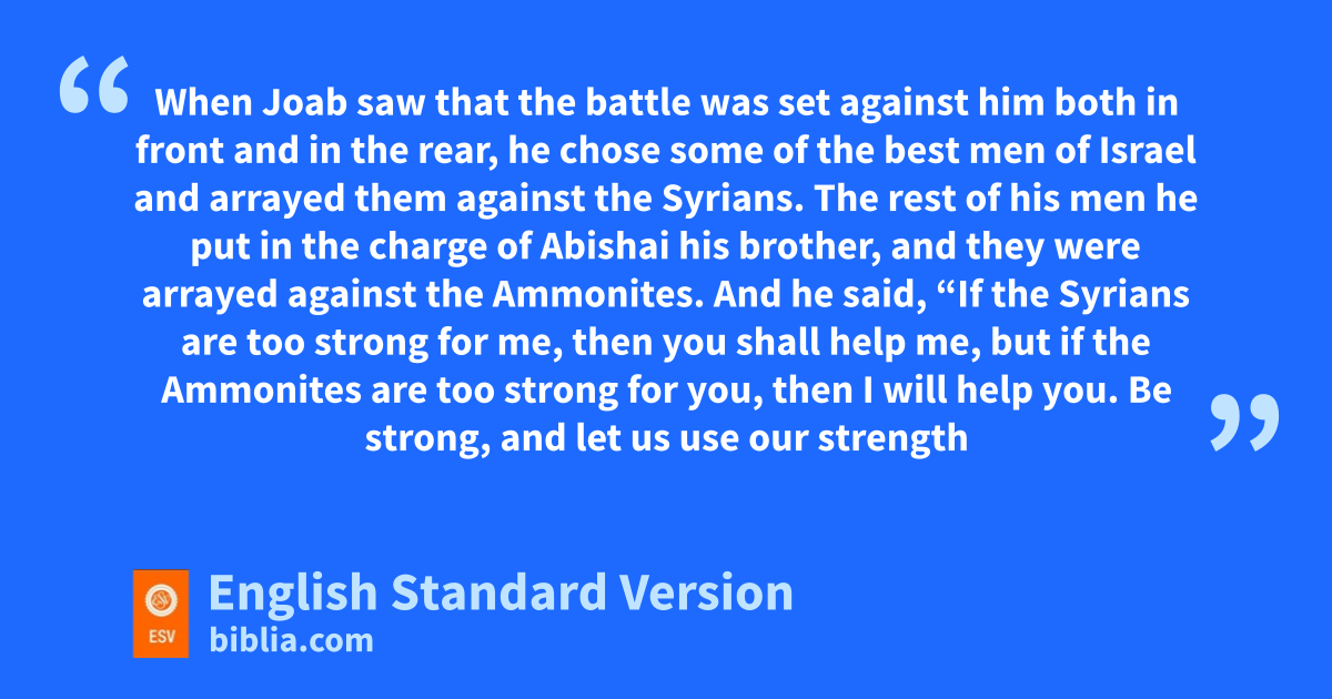 10 When Joab saw that the battle was set against him both in front and in the rear, he chose some of the best men of Israel and arrayed them against the Syrians. 11 The rest of his men he put in the charge of uAbishai his brother, and they were arrayed against the Ammonites. 12 And he said, “If the Syrians are too strong for me, then you shall help me, but if the Ammonites are too strong for you, then I will help you. 13 Be strong, and let us use our strength for our people and for the cities of our God, and may the Lord do what seems good to him.” 14 So Joab and the people who were with him drew near before the Syrians for battle, and they fled before him. 15 And when the Ammonites saw that the Syrians fled, they likewise fled before uAbishai, Joab’s brother, and entered the city. Then Joab came to Jerusalem.