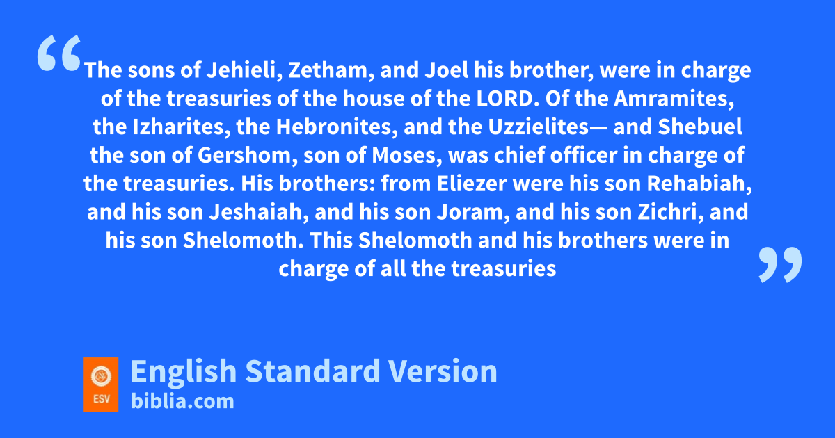 22 qThe sons of Jehieli, Zetham, and Joel his brother, were in charge of the treasuries of the house of the Lord. 23 rOf the Amramites, the Izharites, the Hebronites, and the Uzzielites— 24 and sShebuel the son of Gershom, son of Moses, was chief officer in charge of the treasuries. 25 His brothers: from tEliezer were his son Rehabiah, and his son uJeshaiah, and his son Joram, and his son Zichri, and his son vShelomoth. 26 This Shelomoth and his brothers were in charge of all the treasuries of the dedicated gifts that David the king and the heads of the fathers’ houses and the officers of the thousands and the hundreds and the commanders of the army whad dedicated. 27 From spoil won in battles they dedicated gifts for the maintenance of the house of the Lord. 28 Also all that xSamuel the seer and Saul the son of Kish and Abner the son of Ner and Joab the son of Zeruiah had dedicated—all dedicated gifts were in the care of vShelomoth4 and his brothers.