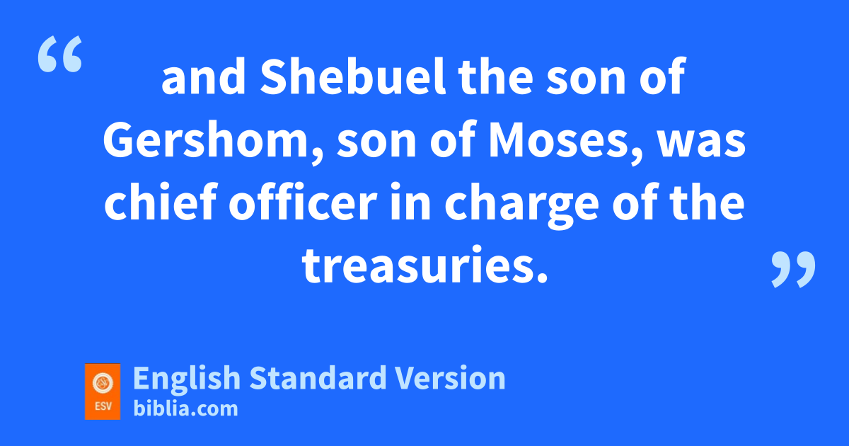 22 qThe sons of Jehieli, Zetham, and Joel his brother, were in charge of the treasuries of the house of the Lord. 23 rOf the Amramites, the Izharites, the Hebronites, and the Uzzielites— 24 and sShebuel the son of Gershom, son of Moses, was chief officer in charge of the treasuries. 25 His brothers: from tEliezer were his son Rehabiah, and his son uJeshaiah, and his son Joram, and his son Zichri, and his son vShelomoth. 26 This Shelomoth and his brothers were in charge of all the treasuries of the dedicated gifts that David the king and the heads of the fathers’ houses and the officers of the thousands and the hundreds and the commanders of the army whad dedicated. 27 From spoil won in battles they dedicated gifts for the maintenance of the house of the Lord. 28 Also all that xSamuel the seer and Saul the son of Kish and Abner the son of Ner and Joab the son of Zeruiah had dedicated—all dedicated gifts were in the care of vShelomoth4 and his brothers.