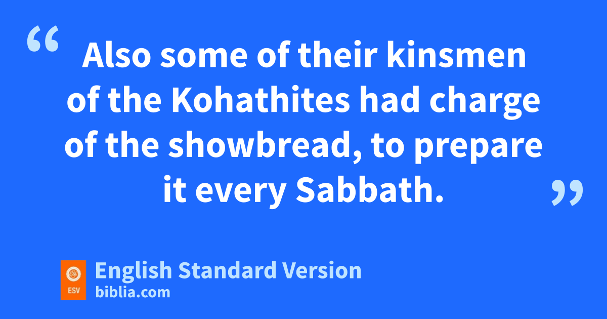 28 Some of them had charge of the utensils of service, for they were required to count them when they were brought in and taken out. 29 Others of them were appointed over the furniture and over all the holy utensils, also over the nfine flour, the wine, the oil, the incense, and the spices. 30 Others, of the sons of the priests, oprepared the mixing of the spices, 31 and Mattithiah, one of the Levites, the firstborn of pShallum the eKorahite, was entrusted with qmaking the flat cakes. 32 Also some of their kinsmen of the Kohathites had rcharge of the showbread, to prepare it every Sabbath.