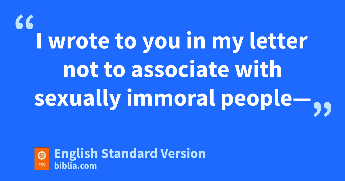 9 I wrote to you in my letter jnot to associate with sexually immoral people— 10 knot at all meaning lthe sexually immoral of this world, or the greedy and swindlers, or idolaters, msince then you would need to go out of the world. 11 But now I am writing to you not to associate with anyone nwho bears the name of brother if he is guilty of sexual immorality or greed, or is an idolater, reviler, drunkard, or swindler—not even to eat with such a one. 12 For what have I to do with judging ooutsiders? pIs it not those inside the church2 whom you are to judge? 13 God judges3 those outside. q“Purge the evil person from among you.”