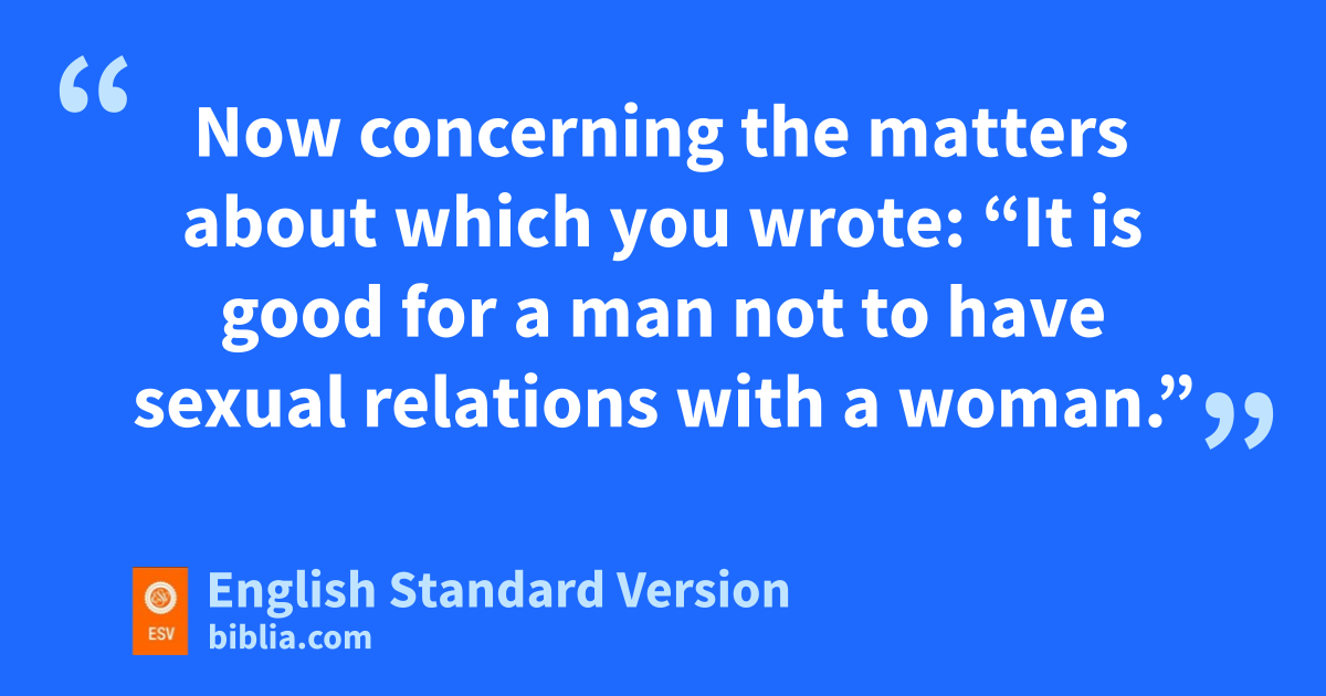 7 Now concerning the matters about which you wrote: t“It is good for a man not to have sexual relations with a woman.” 2 But because of the temptation to sexual immorality, each man should have his own wife and each woman her own husband. 3 uThe husband should give to his wife her conjugal rights, and likewise the wife to her husband. 4 For the wife does not have authority over her own body, but the husband does. Likewise the husband does not have authority over his own body, but the wife does. 5 vDo not deprive one another, except perhaps by agreement for a limited time, that you may devote yourselves to prayer; but then come together again, wso that Satan may not tempt you because of your lack of self-control.