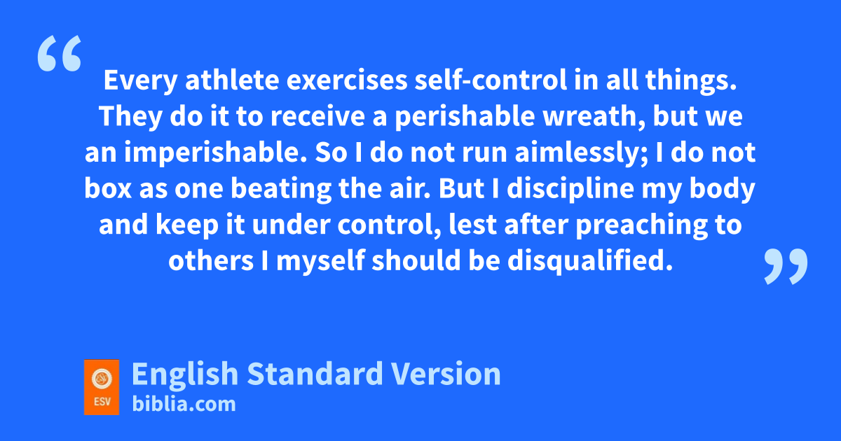 24 Do you not know that in a race all the runners run, but only one receives sthe prize? So trun that you may obtain it. 25 Every uathlete exercises self-control in all things. They do it to receive a perishable wreath, but we van imperishable. 26 So I do not run aimlessly; I wdo not box as one xbeating the air. 27 But I discipline my body and ykeep it under control,2 lest after preaching to others zI myself should be adisqualified.