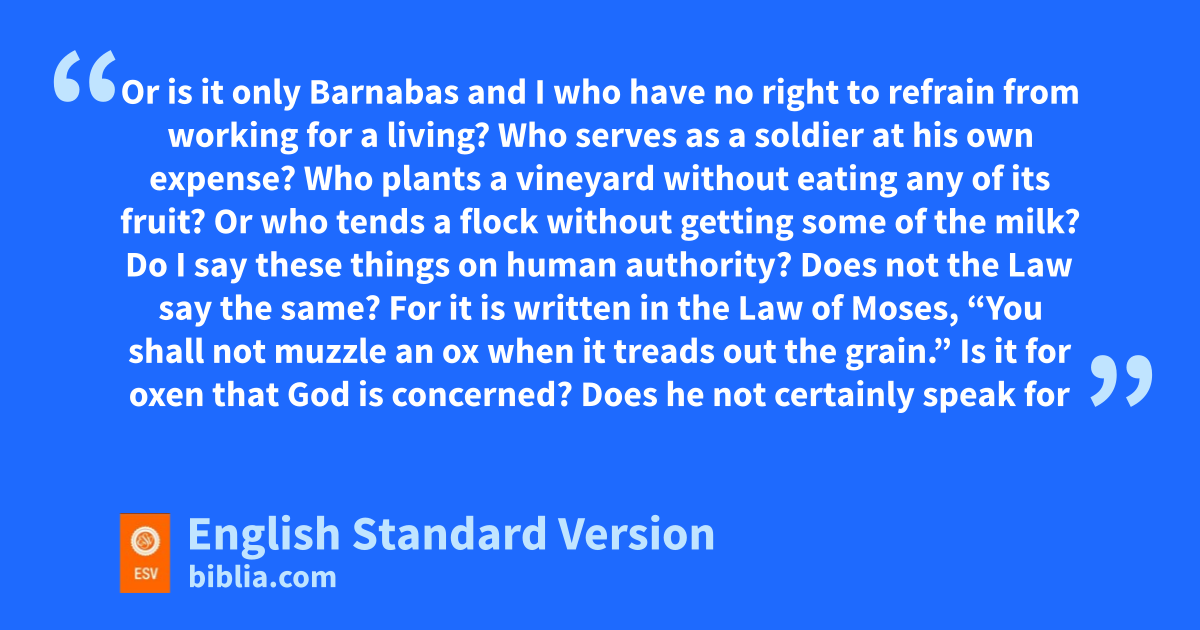 8 Do I say these things on human authority? Does not the Law say the same? 9 For it is written in the Law of Moses, u“You shall not muzzle an ox when it treads out the grain.” Is it for oxen that God is concerned? 10 Does he not certainly speak for our sake? It was written vfor our sake, because wthe plowman should plow in hope and the thresher thresh in hope of sharing in the crop. 11 xIf we have sown spiritual things among you, is it too much if we reap material things from you? 12 If others share this rightful claim on you, do not we even more?