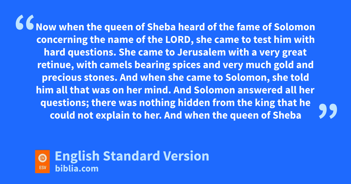 10 yNow when zthe queen of aSheba heard of the fame of Solomon concerning the name of the Lord, she came bto test him with hard questions. 2 She came to Jerusalem with a very great retinue, with camels cbearing spices and very much gold and precious stones. And when she came to Solomon, she told him all that was on her mind. 3 And Solomon answered all her questions; there was nothing hidden from the king that he could not explain to her. 4 And when the queen of Sheba had seen all the wisdom of Solomon, the house that he had built, 5 the food of his table, the seating of his officials, and the attendance of his servants, their clothing, his cupbearers, and his burnt offerings that he offered at the house of the Lord, there was no more breath in her.