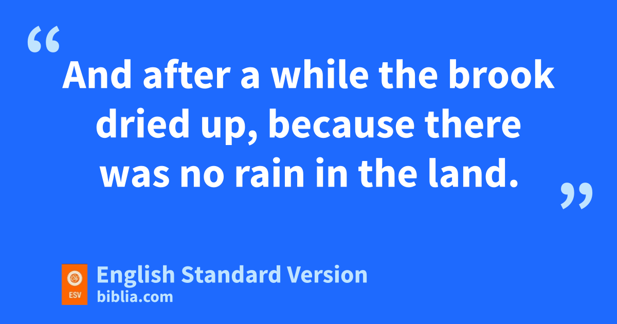 17 Now Elijah the Tishbite, of sTishbe1 in Gilead, said to Ahab, t“As the Lord, the God of Israel, lives, ubefore whom I stand, vthere shall be neither dew nor rain these years, except by my word.” 2 And the word of the Lord came to him: 3 “Depart from here and turn eastward and hide yourself by the brook Cherith, which is east of the Jordan. 4 You shall drink from the brook, and I have commanded the ravens to feed you there.” 5 So he went and did according to the word of the Lord. He went and lived by the brook Cherith that is east of the Jordan. 6 And the ravens brought him bread and meat in the morning, and bread and meat in the evening, and he drank from the brook. 7 And after a while the brook dried up, because there was no rain in the land.