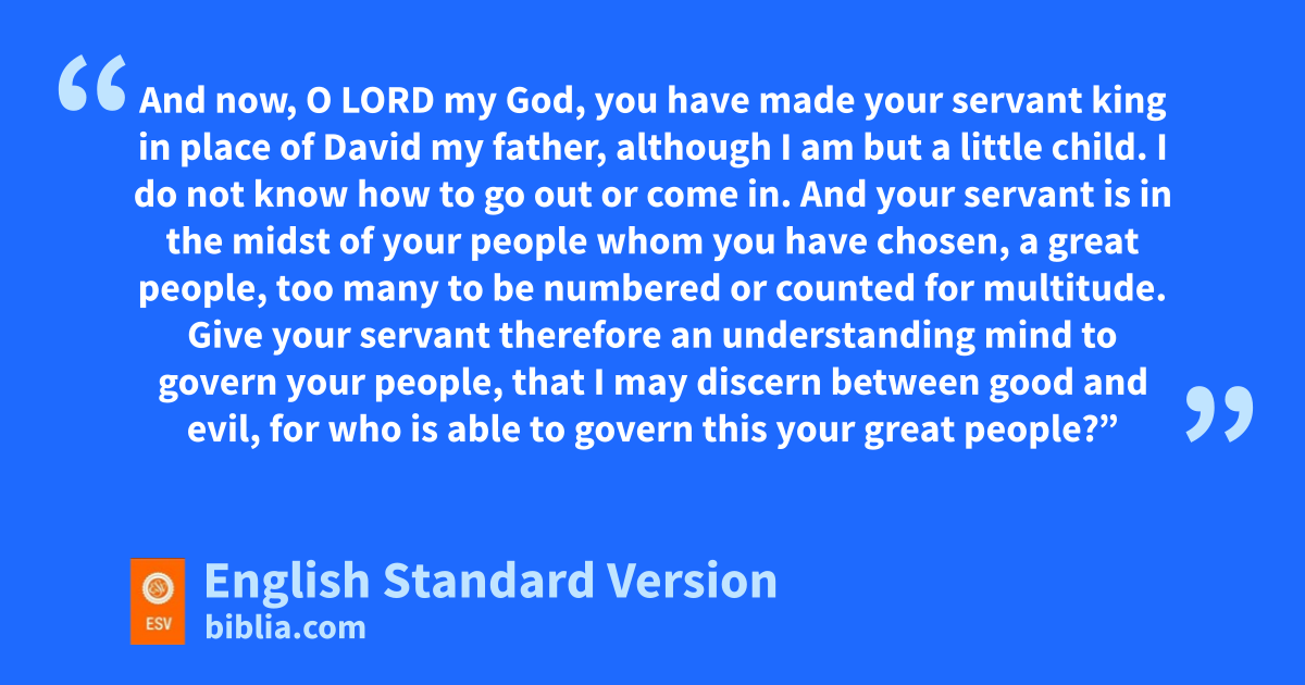 3 Solomon bloved the Lord, cwalking in the statutes of David his father, only he sacrificed and made offerings at the high places. 4 And the king went to Gibeon to sacrifice there, dfor that was the great high place. Solomon used to offer a thousand burnt offerings on that altar. 5 eAt Gibeon fthe Lord appeared to Solomon gin a dream by night, and God said, “Ask what I shall give you.” 6 And Solomon said, “You have shown great and steadfast love to your servant David my father, because hhe walked before you in faithfulness, in righteousness, and in uprightness of heart toward you. And you have kept for him this great and steadfast love and ihave given him a son to sit on his throne this day. 7 And now, O Lord my God, jyou have made your servant king in place of David my father, kalthough I am but a little child. I do not know lhow to go out or come in. 8 mAnd your servant is in the midst of your people whom you have chosen, a great people, ntoo many to be numbered or counted for multitude. 9 oGive your servant therefore an understanding mind pto govern your people, that I may qdiscern between good and evil, for who is able to govern this your great people?”