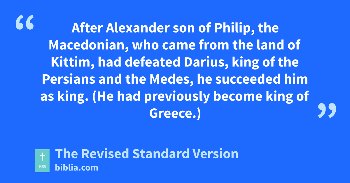 1 After Alexander son of Philip, the Macedonian, who came from the land of Kittim, had defeated Darius, king of the Persians and the Medes, he succeeded him as king. (He had previously become king of Greece.) 2 He fought many battles, conquered strongholds, and put to death the kings of the earth. 3 He advanced to the ends of the earth, and plundered many nations. When the earth became quiet before him, he was exalted, and his heart was lifted up. 4 He gathered a very strong army and ruled over countries, nations, and princes, and they became tributary to him.