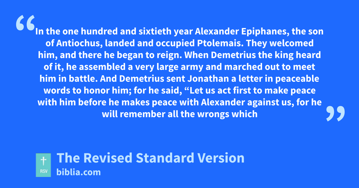1 In the one hundred and sixtieth year Alexander Epiphanes, the son of Antiochus, landed and occupied Ptolemais. They welcomed him, and there he began to reign. 2 When Demetrius the king heard of it, he assembled a very large army and marched out to meet him in battle. 3 And Demetrius sent Jonathan a letter in peaceable words to honor him; 4 for he said, “Let us act first to make peace with him before he makes peace with Alexander against us, 5 for he will remember all the wrongs which we did to him and to his brothers and his nation.” 6 So Demetrius gave him authority to recruit troops, to equip them with arms, and to become his ally; and he commanded that the hostages in the citadel should be released to him.