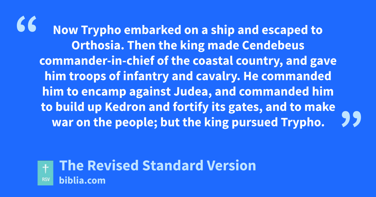 37 Now Trypho embarked on a ship and escaped to Orthosia. 38 Then the king made Cendebeus commander-in-chief of the coastal country, and gave him troops of infantry and cavalry. 39 He commanded him to encamp against Judea, and commanded him to build up Kedron and fortify its gates, and to make war on the people; but the king pursued Trypho. 40 So Cendebeus came to Jamnia and began to provoke the people and invade Judea and take the people captive and kill them. 41 He built up Kedron and stationed there horsemen and troops, so that they might go out and make raids along the highways of Judea, as the king had ordered him.