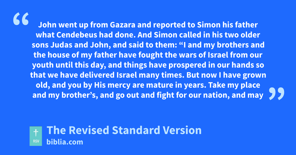 1 John went up from Gazara and reported to Simon his father what Cendebeus had done. 2 And Simon called in his two older sons Judas and John, and said to them: “I and my brothers and the house of my father have fought the wars of Israel from our youth until this day, and things have prospered in our hands so that we have delivered Israel many times. 3 But now I have grown old, and you by His mercy are mature in years. Take my place and my brother’s, and go out and fight for our nation, and may the help which comes from Heaven be with you.”