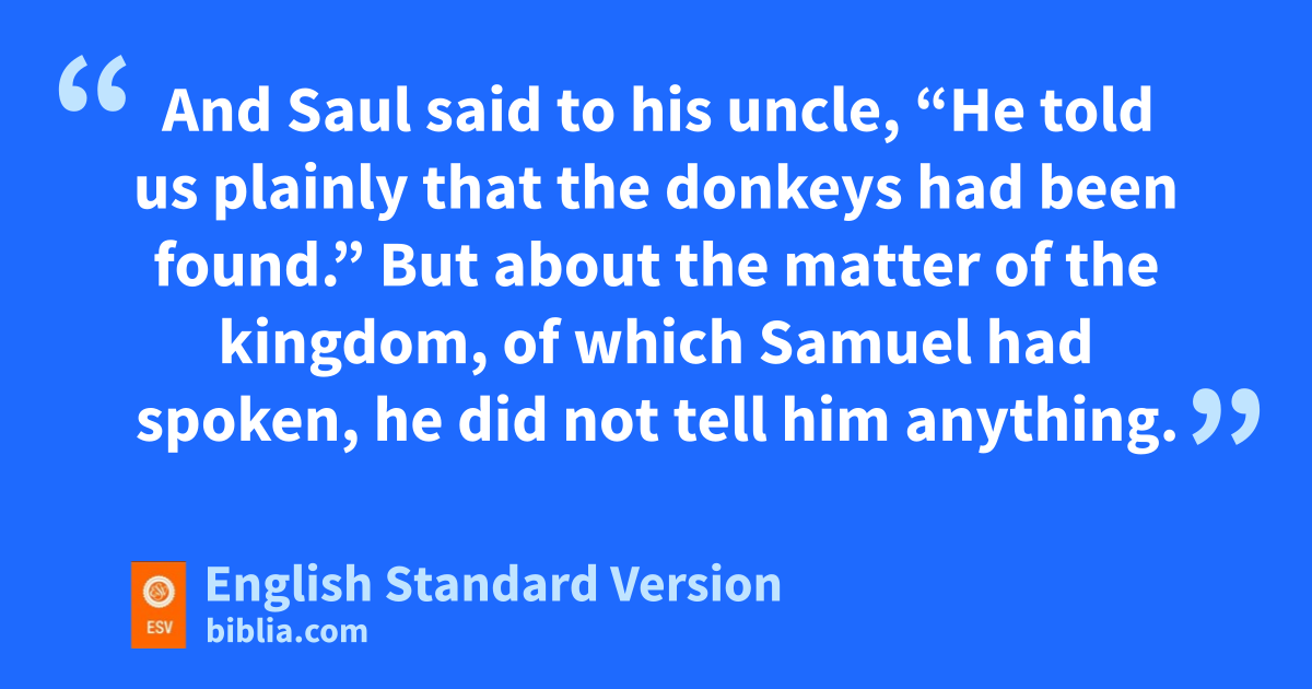 14 ySaul’s uncle said to him and to his servant, “Where did you go?” And he said, z“To seek the donkeys. And when we saw they were not to be found, we went to Samuel.” 15 And Saul’s uncle said, “Please tell me what Samuel said to you.” 16 And Saul said to his uncle, a“He told us plainly that the donkeys had been found.” But about the matter of the kingdom, of which Samuel had spoken, he did not tell him anything.