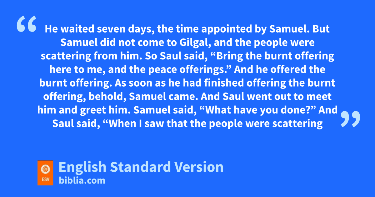 8 sHe waited seven days, the time appointed by Samuel. But Samuel did not come to Gilgal, and the people were scattering from him. 9 So Saul said, “Bring the burnt offering here to me, and the peace offerings.” And he offered the burnt offering. 10 As soon as he had finished offering the burnt offering, behold, Samuel came. And Saul went out to meet him and greet him. 11 Samuel said, “What have you done?” And Saul said, “When I saw that the people were scattering from me, and that you did not come within the days appointed, and that the Philistines had mustered at Michmash, 12 I said, ‘Now the Philistines will come down against me at Gilgal, and I have not sought the favor of the Lord.’ So I forced myself, and offered the burnt offering.” 13 And Samuel said to Saul, t“You have done foolishly. uYou have not kept the command of the Lord your God, with which he commanded you. For then the Lord would have established your kingdom over Israel forever. 14 But now vyour kingdom shall not continue. The Lord has sought out a man wafter his own heart, and the Lord has commanded him to be prince2 over his people, because you have not kept what the Lord commanded you.” 15 And Samuel arose and went up from Gilgal. The rest of the people went up after Saul to meet the army; they went up from Gilgal3 to xGibeah of Benjamin.