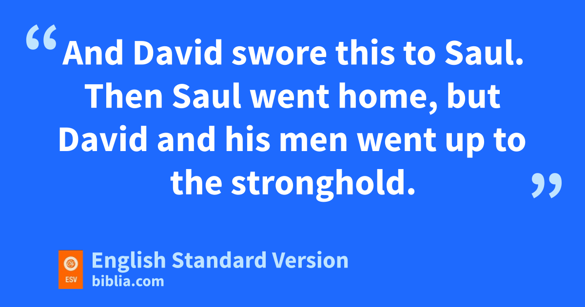 16 As soon as David had finished speaking these words to Saul, Saul said, o“Is this your voice, my son David?” And Saul lifted up his voice and wept. 17 He said to David, “You are more righteous than I, pfor you have repaid me good, whereas I have repaid you evil. 18 And you have declared this day how you have dealt well with me, in that you did not kill me when the Lord put me into your hands. 19 For if a man finds his enemy, will he let him go away safe? So may the Lord reward you with good for what you have done to me this day. 20 And now, behold, qI know that you shall surely be king, and that the kingdom of Israel shall be established in your hand. 21 rSwear to me therefore by the Lord that you will not cut off my offspring after me, and sthat you will not destroy my name out of my father’s house.” 22 And David swore this to Saul. Then Saul went home, but David and his men went up tto the stronghold.