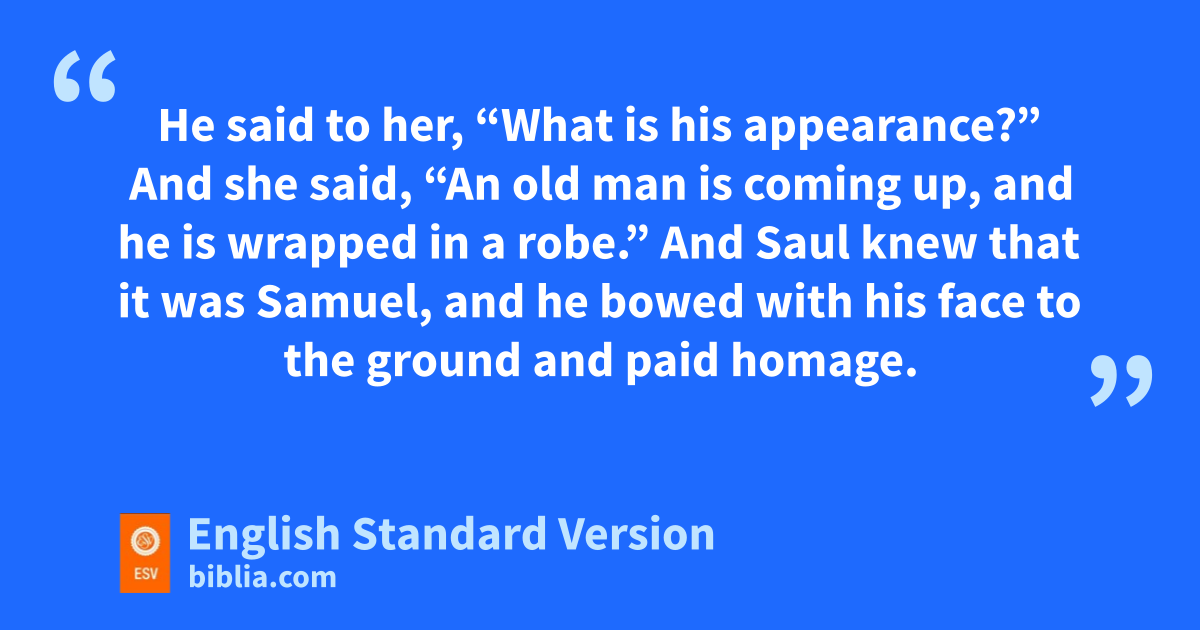 8 So Saul tdisguised himself and put on other garments and went, he and two men with him. And they came to the woman by night. And he said, u“Divine for me by a spirit and bring up for me whomever I shall name to you.” 9 The woman said to him, “Surely you know what Saul has done, lhow he has cut off the mediums and the necromancers from the land. Why then are you laying a trap for my life to bring about my death?” 10 But Saul swore to her by the Lord, v“As the Lord lives, no punishment shall come upon you for this thing.” 11 Then the woman said, “Whom shall I bring up for you?” He said, “Bring up Samuel for me.” 12 When the woman saw Samuel, she cried out with a loud voice. And the woman said to Saul, “Why have you deceived me? You are Saul.” 13 The king said to her, “Do not be afraid. What do you see?” And the woman said to Saul, “I see a god coming up out of the earth.” 14 He said to her, “What is his appearance?” And she said, “An old man is coming up, and he is wrapped win a robe.” And Saul knew that it was Samuel, and he bowed with his face to the ground and paid homage.