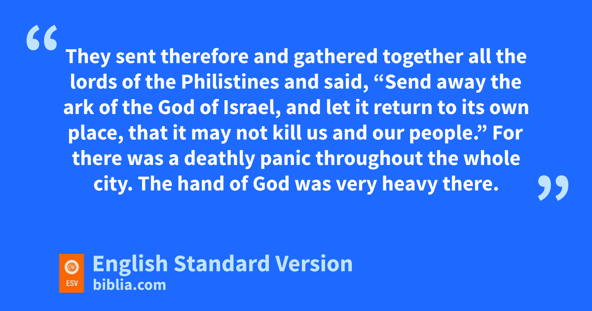 6 wThe hand of the Lord was heavy against the people of Ashdod, and he terrified and afflicted them with xtumors, both Ashdod and its territory. 7 And when the men of Ashdod saw how things were, they said, “The ark of the God of Israel must not remain with us, for his hand is hard against us and against Dagon our god.” 8 So they sent and gathered together all ythe lords of the Philistines and said, “What shall we do with the ark of the God of Israel?” They answered, “Let the ark of the God of Israel be brought around to Gath.” So they brought the ark of the God of Israel there. 9 But after they had brought it around, zthe hand of the Lord was against the city, causing a very great panic, and he afflicted the men of the city, both young and old, so that xtumors broke out on them. 10 So they sent the ark of God to Ekron. But as soon as the ark of God came to Ekron, the people of Ekron cried out, “They have brought around to us the ark of the God of Israel to kill us and our people.” 11 yThey sent therefore and gathered together all the lords of the Philistines and said, “Send away the ark of the God of Israel, and let it return to its own place, that it may not kill us and our people.” For there was a deathly panic throughout the whole city. wThe hand of God was very heavy there. 12 The men who did not die were struck with xtumors, and the cry of the city went up to heaven.