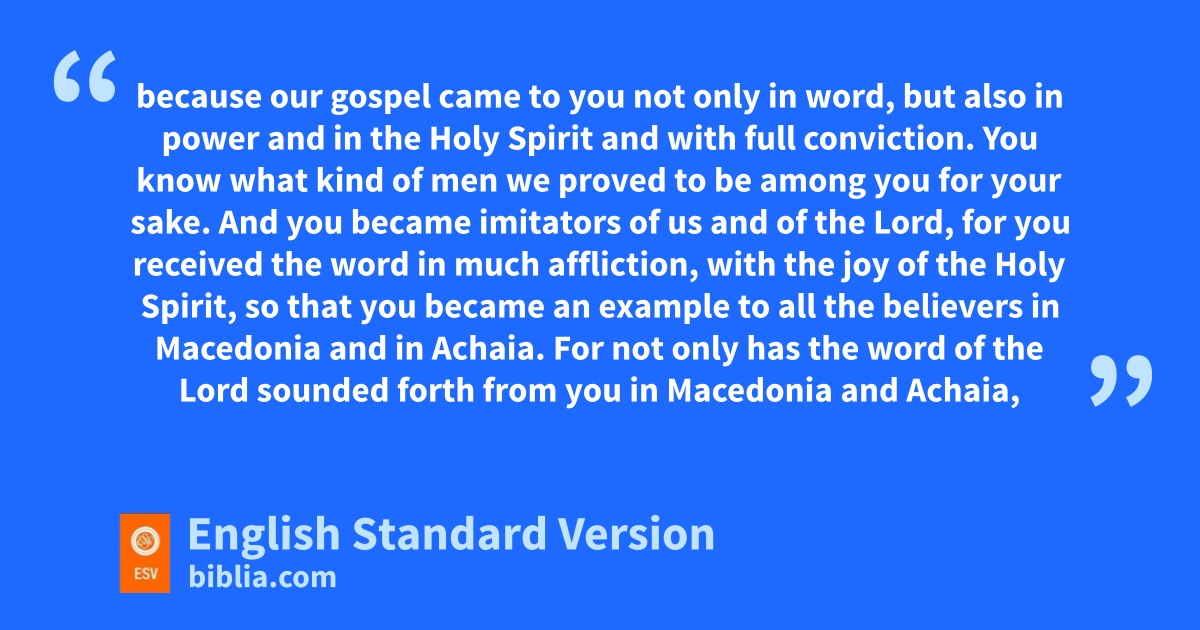 2 dWe give thanks to God always for all of you, constantly1 ementioning you in our prayers, 3 remembering before four God and Father gyour work of faith and labor of hlove and isteadfastness of hope in our Lord Jesus Christ. 4 For we know, jbrothers2 loved by God, kthat he has chosen you, 5 because lour gospel came to you not only in word, but also in power and min the Holy Spirit and with full nconviction. You know owhat kind of men we proved to be among you for your sake. 6 And pyou became imitators of us qand of the Lord, for ryou received the word in much affliction, swith the tjoy of the Holy Spirit, 7 so that you became an example to all the believers in Macedonia and in Achaia. 8 For not only has the word of the Lord usounded forth from you in Macedonia and Achaia, but your faith in God has gone forth veverywhere, so that we need not say anything. 9 For they themselves report concerning us the kind of wreception we had among you, and how xyou turned to God yfrom idols to serve the living and ztrue God, 10 and ato wait for his Son bfrom heaven, cwhom he raised from the dead, Jesus dwho delivers us from ethe wrath to come.