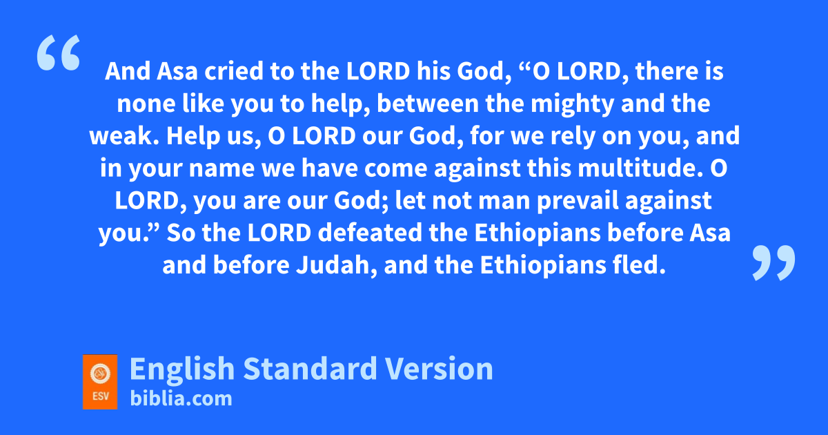 9 Zerah pthe Ethiopian came out against them with an army of a million men and 300 chariots, and came as far as qMareshah. 10 And Asa went out to meet him, and rthey drew up their lines of battle in the Valley of Zephathah at qMareshah. 11 And Asa scried to the Lord his God, “O Lord, there is none like you to help, between the mighty and the weak. Help us, O Lord our God, tfor we rely on you, uand in your name we have come against this multitude. O Lord, you are our God; let not man prevail against you.” 12 vSo the Lord defeated the Ethiopians before Asa and before Judah, and the Ethiopians fled. 13 Asa and the people who were with him pursued them as far as wGerar, and the Ethiopians fell until none remained alive, for they were broken before the Lord and his army. The men of Judah3 carried away very much spoil. 14 And they attacked all the cities around wGerar, xfor the fear of the Lord was upon them. They plundered all the cities, for there was much plunder in them. 15 And they struck down the tents of those who had livestock and carried away sheep in abundance and camels. Then they returned to Jerusalem.
