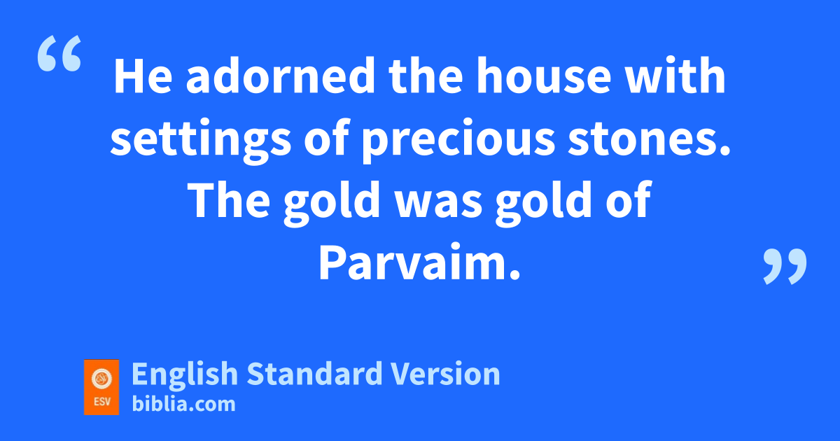 3 wThen Solomon began to build the house of the Lord in Jerusalem xon Mount Moriah, where the Lord1 had appeared to David his father, at the place that David had appointed, yon the threshing floor of Ornan the Jebusite. 2 He began to build in the second month of the fourth year of his reign. 3 These are Solomon’s zmeasurements2 for building the house of God: athe length, in cubits3 of the old standard, was sixty cubits, and the breadth twenty cubits. 4 The vestibule in front of the nave of the house was twenty cubits long, equal to the width of the house,4 and its height was 120 cubits. He overlaid it on the inside with pure gold. 5 bThe nave he lined with cypress and covered it with fine gold cand made palms and chains on it. 6 He adorned the house with settings of precious stones. The gold was gold of Parvaim. 7 So he lined the house with gold—its beams, its thresholds, its walls, and its doors—cand he carved cherubim on the walls.