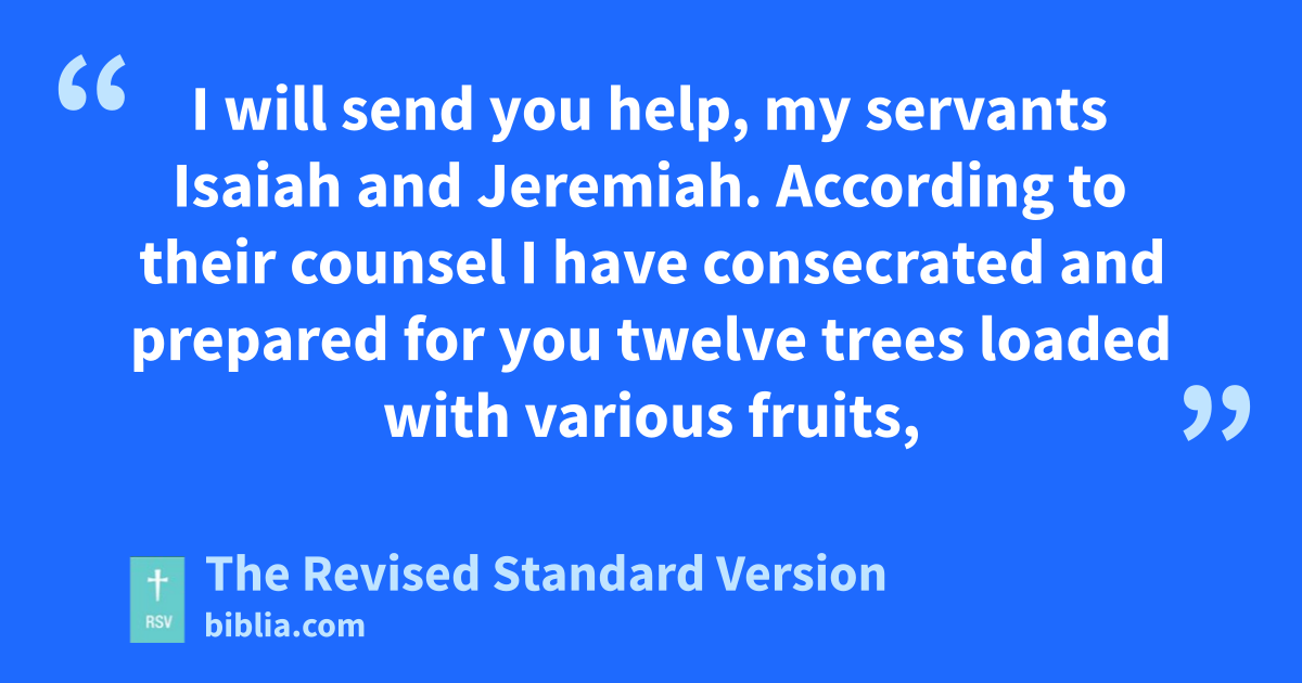 15 “Mother, embrace your sons; bring them up with gladness, as does the dove; establish their feet, because I have chosen you, says the Lord. 16 And I will raise up the dead from their places, and will bring them out from their tombs, because I recognize my name in them. 17 Do not fear, mother of sons, for I have chosen you, says the Lord. 18 I will send you help, my servants Isaiah and Jeremiah. According to their counsel I have consecrated and prepared for you twelve trees loaded with various fruits, 19 and the same number of springs flowing with milk and honey, and seven mighty mountains on which roses and lilies grow; by these I will fill your children with joy. 20 Guard the rights of the widow, secure justice for the fatherless, give to the needy, defend the orphan, clothe the naked, 21 care for the injured and the weak, do not ridicule a lame man, protect the maimed, and let the blind man have a vision of my splendor. 22 Protect the old and the young within your walls; 23 When you find any who are dead, commit them to the grave and mark it, and I will give you the first place in my resurrection. 24 Pause and be quiet, my people, because your rest will come. 25 Good nurse, nourish your sons, and strengthen their feet. 26 Not one of the servants whom I have given you will perish, for I will require them from among your number. 27 Do not be anxious, for when the day of tribulation and anguish comes, others shall weep and be sorrowful, but you shall rejoice and have abundance. 28 The nations shall envy you but they shall not be able to do anything against you, says the Lord. 29 My hands will cover you, that your sons may not see Gehenna. 30 Rejoice, O mother, with your sons, because I will deliver you, says the Lord. 31 Remember your sons that sleep, because I will bring them out of the hiding places of the earth, and will show mercy to them; for I am merciful, says the Lord Almighty. 32 Embrace your children until I come, and proclaim mercy to them; because my springs run over, and my grace will not fail.”