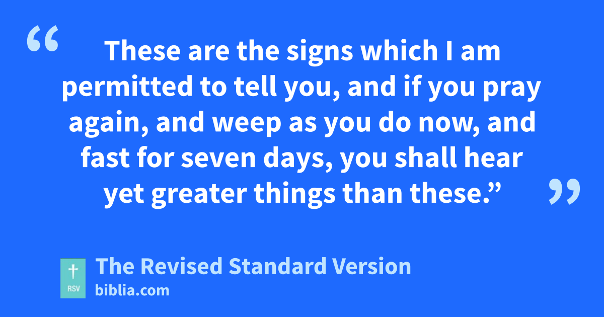 13 These are the signs which I am permitted to tell you, and if you pray again, and weep as you do now, and fast for seven days, you shall hear yet greater things than these.”