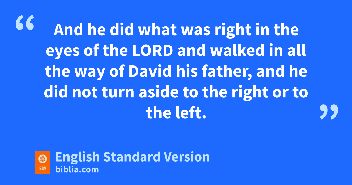 22 aJosiah was eight years old when he began to reign, and he reigned thirty-one years in Jerusalem. His mother’s name was Jedidah the daughter of Adaiah of bBozkath. 2 And he did what was right in the eyes of the Lord and walked in all the way of David his father, cand he did not turn aside to the right or to the left.