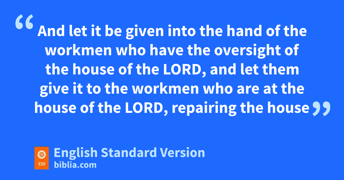 3 In the eighteenth year of King Josiah, the king sent Shaphan the son of Azaliah, son of Meshullam, the secretary, to the house of the Lord, saying, 4 “Go up to dHilkiah the high priest, that he may count the money ethat has been brought into the house of the Lord, which fthe keepers of the threshold have collected from the people. 5 gAnd let it be given into the hand of the workmen who have the oversight of the house of the Lord, and let them give it to the workmen who are at the house of the Lord, repairing the house 6 (that is, to the carpenters, and to the builders, and to the masons), and let them use it for buying timber and quarried stone to repair the house. 7 But hno accounting shall be asked from them for the money that is delivered into their hand, for they deal honestly.”