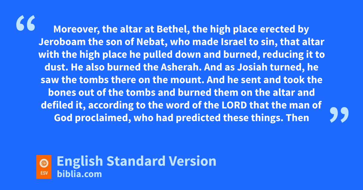 15 Moreover, the altar at Bethel, the high place erected bby Jeroboam the son of Nebat, cwho made Israel to sin, dthat altar with the high place he pulled down and burned,4 reducing it to dust. He also burned the Asherah. 16 And as Josiah turned, he saw the tombs there on the mount. And he sent and took the bones out of the tombs and burned them on the altar and defiled it, eaccording to the word of the Lord that the man of God proclaimed, who had predicted these things. 17 Then he said, “What is that monument that I see?” And the men of the city told him, f“It is the tomb of the man of God who came from Judah and predicted5 these things that you have done against the altar at Bethel.” 18 And he said, “Let him be; let no man move his bones.” So they let his bones alone, with the bones gof the prophet who came out of Samaria. 19 And Josiah removed all the shrines also of the high places that were hin the cities of Samaria, which kings of Israel had made, provoking the Lord to anger. He did to them according to all that he had done at Bethel. 20 And ihe sacrificed all the priests of the high places who were there, on the altars, jand burned human bones on them. Then he returned to Jerusalem.