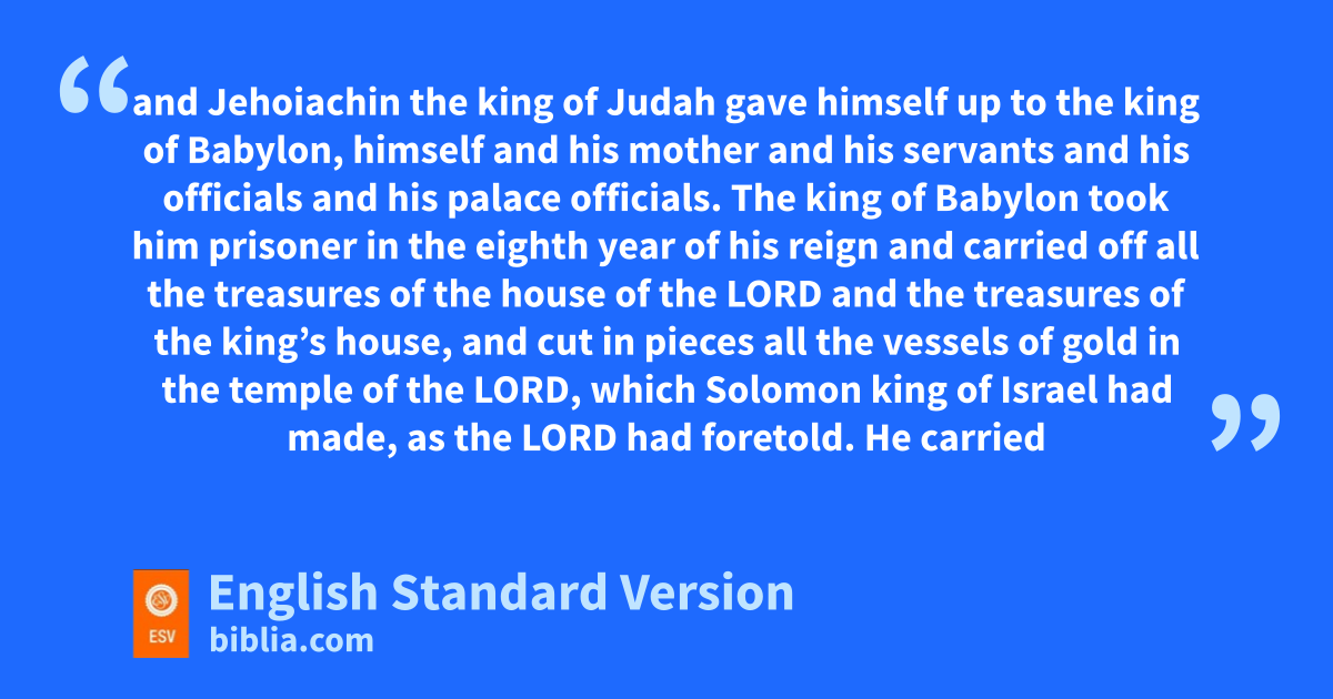 10 At that time the servants of yNebuchadnezzar king of Babylon came up to Jerusalem, and the city was besieged. 11 And yNebuchadnezzar king of Babylon came to the city while his servants were besieging it, 12 zand Jehoiachin the king of Judah gave himself up to the king of Babylon, himself and his mother and his servants and his officials and his palace officials. aThe king of Babylon took him prisoner bin the eighth year of his reign 13 and carried off all the treasures of the house of the Lord cand the treasures of the king’s house, dand cut in pieces all the vessels of gold in the temple of the Lord, ewhich Solomon king of Israel had made, fas the Lord had foretold. 14 gHe carried away all Jerusalem and all the officials and all the mighty men of valor, h10,000 captives, iand all the craftsmen and the smiths. None remained, jexcept the poorest people of the land. 15 kAnd he carried away Jehoiachin to Babylon. The king’s mother, the king’s wives, his officials, and the chief men of the land he took into captivity from Jerusalem to Babylon. 16 And the king of Babylon brought captive to Babylon all the men of valor, l7,000, and the craftsmen and the metal workers, 1,000, all of them strong and fit for war. 17 mAnd the king of Babylon nmade Mattaniah, oJehoiachin’s uncle, king in his place, pand changed his name to Zedekiah.