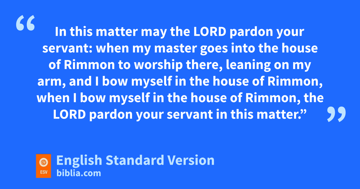 15 Then he returned to the man of God, he and all his company, and he came and stood before him. And he said, “Behold, I know that zthere is no God in all the earth but in Israel; so aaccept now a present from your servant.” 16 But he said, b“As the Lord lives, before whom I stand, cI will receive none.” And he urged him to take it, but he refused. 17 Then Naaman said, “If not, please let there be given to your servant two mule loads of earth, for from now on your servant will not offer burnt offering or sacrifice to any god but the Lord. 18 In this matter may the Lord pardon your servant: when my master goes into the house of dRimmon to worship there, eleaning on my arm, and I bow myself in the house of Rimmon, when I bow myself in the house of Rimmon, the Lord pardon your servant in this matter.” 19 He said to him, f“Go in peace.”