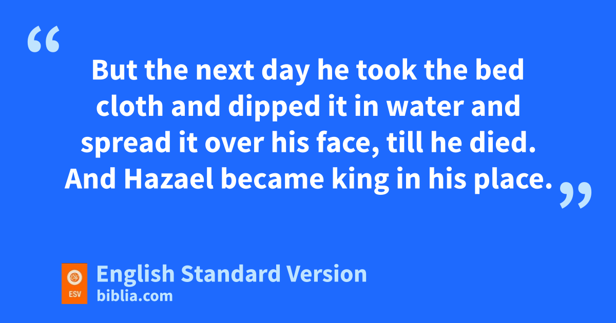 7 Now Elisha came to uDamascus. vBen-hadad the king of Syria was sick. And when it was told him, “The man of God has come here,” 8 the king said to wHazael, x“Take a present with you and go to meet the man of God, yand inquire of the Lord through him, saying, ‘Shall I recover from this sickness?’ ” 9 So Hazael went to meet him, and took a present with him, all kinds of goods of Damascus, forty camels’ loads. When he came and stood before him, he said, z“Your son Ben-hadad king of Syria has sent me to you, saying, ‘Shall I recover from this sickness?’ ” 10 And Elisha said to him, a“Go, say to him, ‘You shall certainly recover,’ but1 the Lord has shown me that bhe shall certainly die.” 11 And he fixed his gaze and stared at him, cuntil he was embarrassed. And the man of God wept. 12 And Hazael said, “Why does my lord weep?” He answered, “Because I know dthe evil that you will do to the people of Israel. You will set on fire their fortresses, and you will kill their young men with the sword eand dash in pieces their little ones and rip open their pregnant women.” 13 And Hazael said, “What is your servant, fwho is but a dog, that he should do this great thing?” Elisha answered, g“The Lord has shown me that you are to be king over Syria.” 14 Then he departed from Elisha and came to his master, who said to him, “What did Elisha say to you?” And he answered, “He told me hthat you would certainly recover.” 15 But the next day he took the bed cloth2 and dipped it in water and spread it over his face, till he died. And Hazael became king in his place.