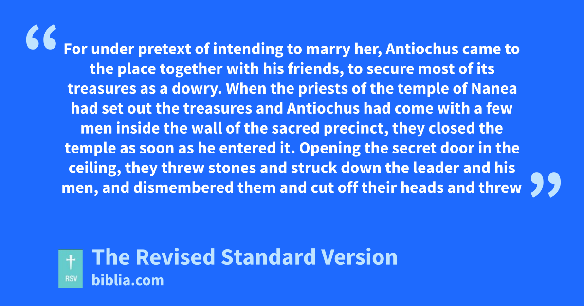 Greeting, and good health. 11 Having been saved by God out of grave dangers we thank him greatly for taking our side against the king. 12 For he drove out those who fought against the holy city. 13 For when the leader reached Persia with a force that seemed irresistible, they were cut to pieces in the temple of Nanea by a deception employed by the priests of Nanea. 14 For under pretext of intending to marry her, Antiochus came to the place together with his friends, to secure most of its treasures as a dowry. 15 When the priests of the temple of Nanea had set out the treasures and Antiochus had come with a few men inside the wall of the sacred precinct, they closed the temple as soon as he entered it. 16 Opening the secret door in the ceiling, they threw stones and struck down the leader and his men, and dismembered them and cut off their heads and threw them to the people outside. 17 Blessed in every way be our God, who has brought judgment upon those who have behaved impiously.