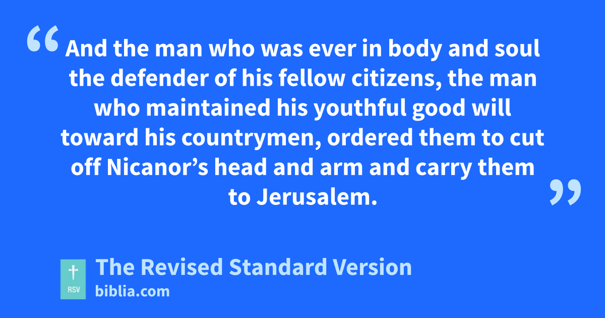 28 When the action was over and they were returning with joy, they recognized Nicanor, lying dead, in full armor. 29 Then there was shouting and tumult, and they blessed the Sovereign Lord in the language of their fathers. 30 And the man who was ever in body and soul the defender of his fellow citizens, the man who maintained his youthful good will toward his countrymen, ordered them to cut off Nicanor’s head and arm and carry them to Jerusalem. 31 And when he arrived there and had called his countrymen together and stationed the priests before the altar, he sent for those who were in the citadel. 32 He showed them the vile Nicanor’s head and that profane man’s arm, which had been boastfully stretched out against the holy house of the Almighty; 33 and he cut out the tongue of the ungodly Nicanor and said that he would give it piecemeal to the birds and hang up these rewards of his folly opposite the sanctuary. 34 And they all, looking to heaven, blessed the Lord who had manifested himself, saying, “Blessed is he who has kept his own place undefiled.” 35 And he hung Nicanor’s head from the citadel, a clear and conspicuous sign to every one of the help of the Lord. 36 And they all decreed by public vote never to let this day go unobserved, but to celebrate the thirteenth day of the twelfth month— which is called Adar in the Syrian language—the day before Mordecai’s day.