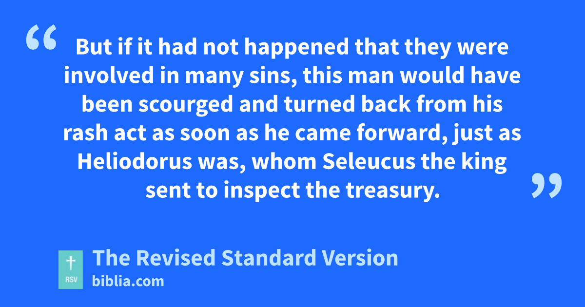 15 Not content with this, Antiochus dared to enter the most holy temple in all the world, guided by Menelaus, who had become a traitor both to the laws and to his country. 16 He took the holy vessels with his polluted hands, and swept away with profane hands the votive offerings which other kings had made to enhance the glory and honor of the place. 17 Antiochus was elated in spirit, and did not perceive that the Lord was angered for a little while because of the sins of those who dwelt in the city, and that therefore he was disregarding the holy place. 18 But if it had not happened that they were involved in many sins, this man would have been scourged and turned back from his rash act as soon as he came forward, just as Heliodorus was, whom Seleucus the king sent to inspect the treasury. 19 But the Lord did not choose the nation for the sake of the holy place, but the place for the sake of the nation. 20 Therefore the place itself shared in the misfortunes that befell the nation and afterward participated in its benefits; and what was forsaken in the wrath of the Almighty was restored again in all its glory when the great Lord became reconciled.
