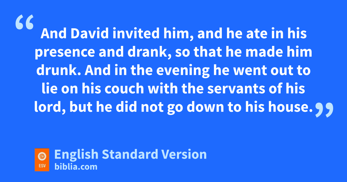 6 So David sent word to Joab, “Send me Uriah the Hittite.” And Joab sent Uriah to David. 7 When Uriah came to him, David asked how Joab was doing and how the people were doing and how the war was going. 8 Then David said to Uriah, “Go down to your house and owash your feet.” And Uriah went out of the king’s house, and there followed him a present from the king. 9 But Uriah slept at the door of the king’s house with all the servants of his lord, and did not go down to his house. 10 When they told David, “Uriah did not go down to his house,” David said to Uriah, “Have you not come from a journey? Why did you not go down to your house?” 11 Uriah said to David, p“The ark and Israel and Judah dwell in booths, and my lord Joab and qthe servants of my lord are camping in the open field. Shall I then go to my house, to eat and to drink and to lie with my wife? As you live, and ras your soul lives, I will not do this thing.” 12 Then David said to Uriah, “Remain here today also, and tomorrow I will send you back.” So Uriah remained in Jerusalem that day and the next. 13 And David invited him, and he ate in his presence and drank, sso that he made him drunk. And in the evening he went out to lie on his couch with qthe servants of his lord, but he did not go down to his house.