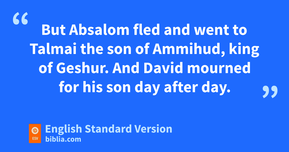 37 qBut Absalom fled and went to rTalmai the son of Ammihud, king of sGeshur. And David mourned for his son day after day. 38 qSo Absalom fled and went to Geshur, and was there three years. 39 And the spirit of the king6 longed to go out7 to Absalom, because the was comforted about Amnon, since he was dead.