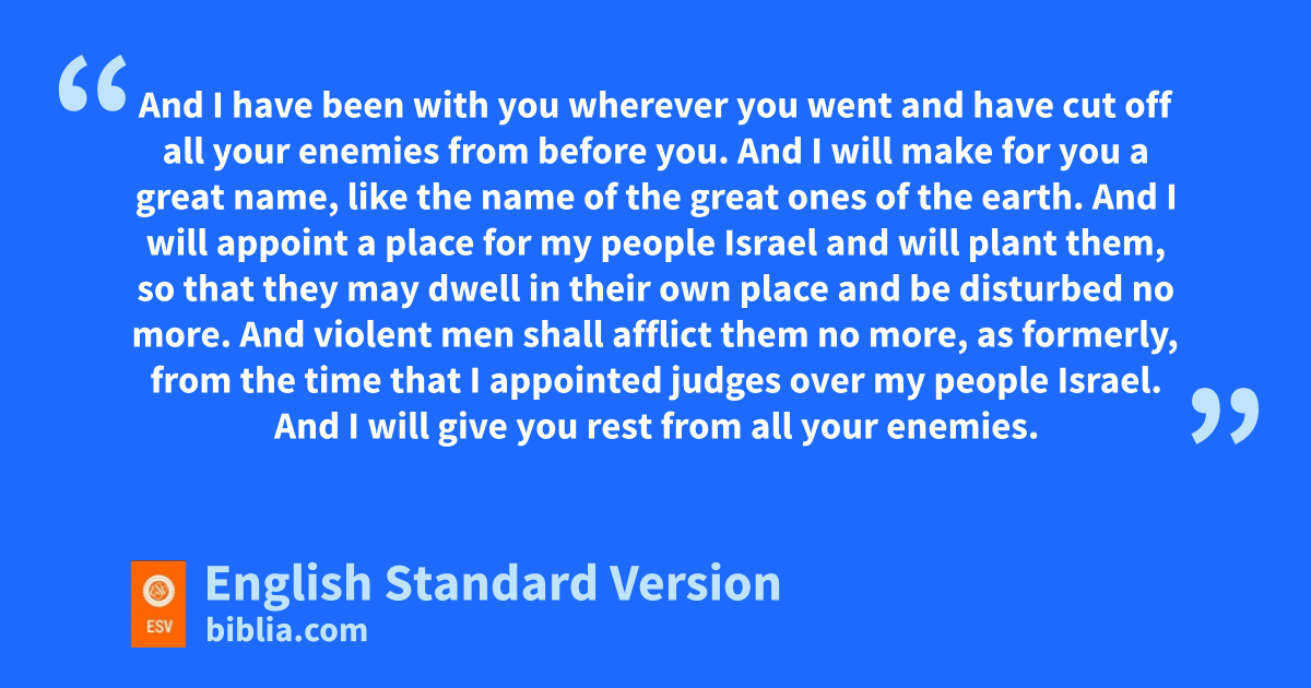 4 But that same night the word of the Lord came to Nathan, 5 “Go and tell my servant David, ‘Thus says the Lord: yWould you build me a house to dwell in? 6 I have not lived in a house zsince the day I brought up the people of Israel from Egypt to this day, but I have been moving about ain a tent for my dwelling. 7 In all places where bI have moved with all the people of Israel, did I speak a word with cany of the judges1 of Israel, whom I commanded dto shepherd my people Israel, saying, “Why have you not built me a house of cedar?” ’ 8 Now, therefore, thus you shall say to my servant David, ‘Thus says the Lord of hosts, eI took you from the pasture, from following the sheep, that you should be prince2 over my people Israel. 9 fAnd I have been with you wherever you went and have cut off all your enemies from before you. And I will make for you a great name, like the name of the great ones of the earth. 10 And I will appoint a place for my people Israel gand will plant them, so that they may dwell in their own place hand be disturbed no more. iAnd violent men shall afflict them no more, as formerly, 11 jfrom the time that I appointed judges over my people Israel. And kI will give you rest from all your enemies. Moreover, the Lord declares to you that lthe Lord will make you a house. 12 mWhen your days are fulfilled and nyou lie down with your fathers, oI will raise up your offspring after you, who shall come from your body, and I will establish his kingdom. 13 pHe shall build a house for my name, and qI will establish the throne of his kingdom forever. 14 rI will be to him a father, and he shall be to me a son. When he commits iniquity, sI will discipline him with the rod of men, with the stripes of the sons of men, 15 sbut my steadfast love will not depart from him, tas I took it from Saul, whom I put away from before you. 16 uAnd your house and your kingdom shall be made sure forever before me.3 uYour throne shall be established forever.’ ” 17 In accordance with all these words, and in accordance with all this vision, Nathan spoke to David.