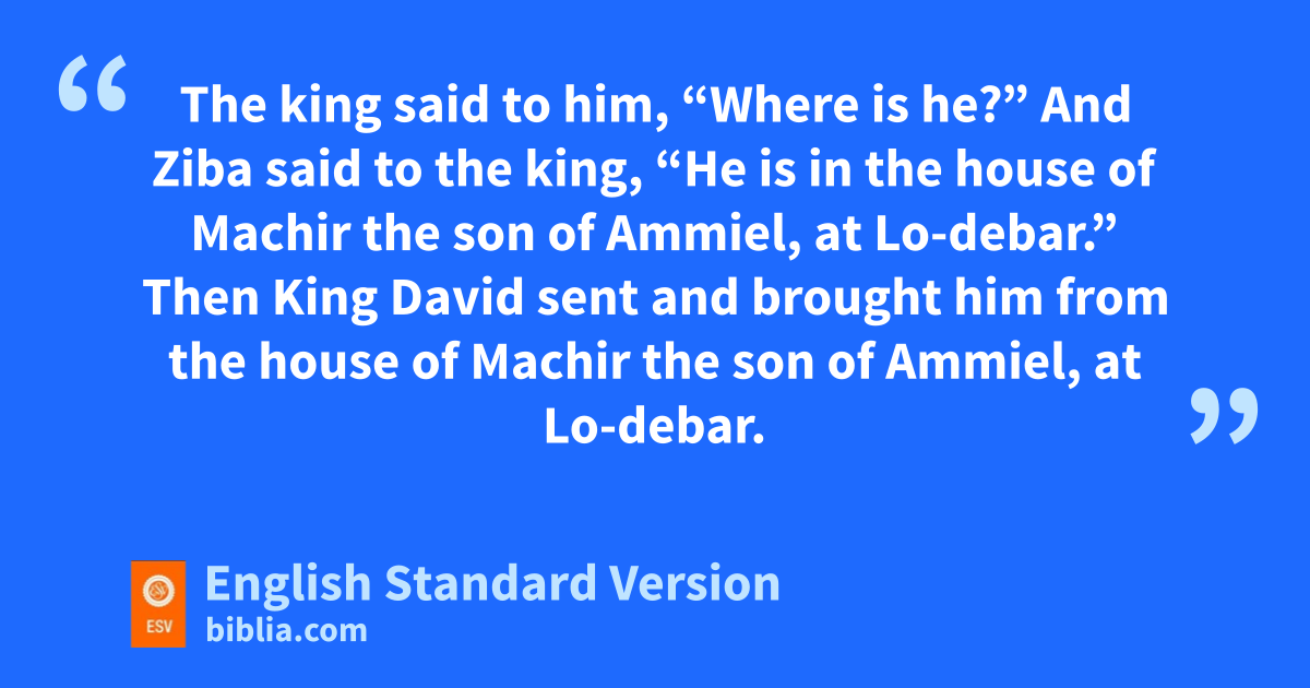 9 And David said, “Is there still anyone left of the house of Saul, that I may ishow him kindness for Jonathan’s sake?” 2 Now there was a servant of the house of Saul whose name was jZiba, and they called him to David. And the king said to him, “Are you Ziba?” And he said, “I am your servant.” 3 And the king said, “Is there not still someone of the house of Saul, that I may show kthe kindness of God to him?” Ziba said to the king, “There is still a son of lJonathan; he is crippled in his feet.” 4 The king said to him, “Where is he?” And Ziba said to the king, “He is in the house of mMachir the son of Ammiel, at Lo-debar.” 5 Then King David sent and brought him from the house of Machir the son of Ammiel, at Lo-debar. 6 And nMephibosheth the son of Jonathan, son of Saul, came to David and fell on his face and paid homage. And David said, “Mephibosheth!” And he answered, “Behold, I am your servant.” 7 And David said to him, “Do not fear, ifor I will show you kindness for the sake of your father Jonathan, and I will restore to you all the land of Saul your father, and oyou shall eat at my table always.” 8 And he paid homage and said, “What is your servant, that you should show regard for pa dead dog such as I?”