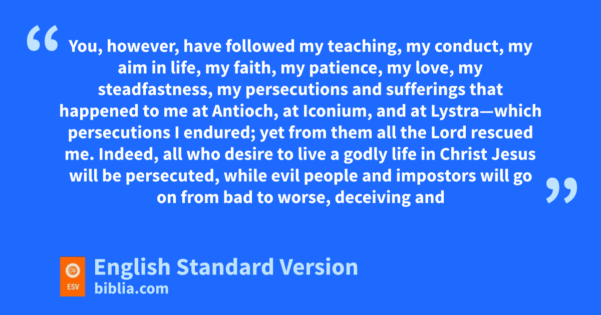 10 pYou, however, have followed my teaching, my conduct, my aim in life, my faith, my patience, my love, my steadfastness, 11 my persecutions and sufferings that happened to me qat Antioch, rat Iconium, and sat Lystra—which persecutions I endured; yet tfrom them all uthe Lord rescued me. 12 Indeed, all who desire to vlive a godly life in Christ Jesus wwill be persecuted, 13 while xevil people and impostors will go on from bad to worse, deceiving and ybeing deceived. 14 But as for you, zcontinue in what you have learned and have firmly believed, knowing from whom1 you learned it 15 and how afrom childhood you have been acquainted with bthe sacred writings, cwhich are able to make you wise for salvation through faith in Christ Jesus. 16 dAll Scripture is breathed out by God and profitable for teaching, for reproof, for correction, and for training in righteousness, 17 that ethe man of God2 may be complete, fequipped gfor every good work.
