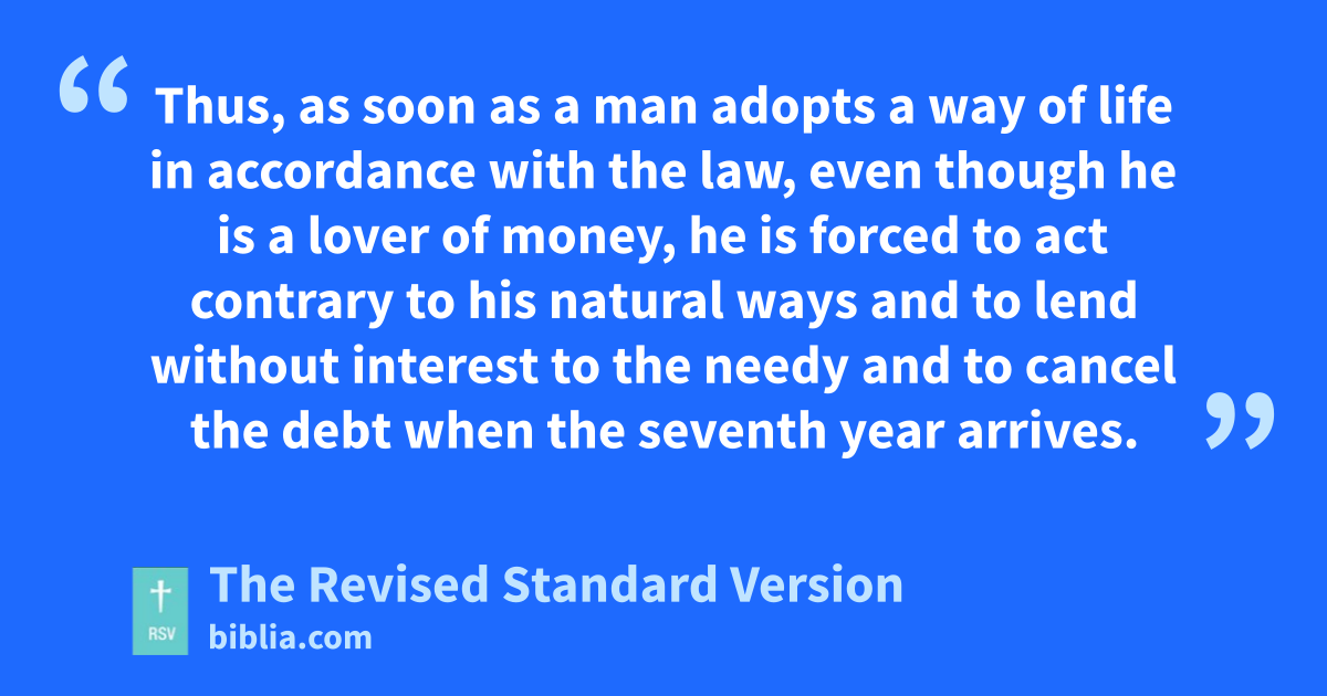 Just so it is with the emotions that hinder one from justice. 7 Otherwise how could it be that someone who is habitually a solitary gormandizer, a glutton, or even a drunkard can learn a better way, unless reason is clearly lord of the emotions? 8 Thus, as soon as a man adopts a way of life in accordance with the law, even though he is a lover of money, he is forced to act contrary to his natural ways and to lend without interest to the needy and to cancel the debt when the seventh year arrives. 9 If one is greedy, he is ruled by the law through his reason so that he neither gleans his harvest nor gathers the last grapes from the vineyard.