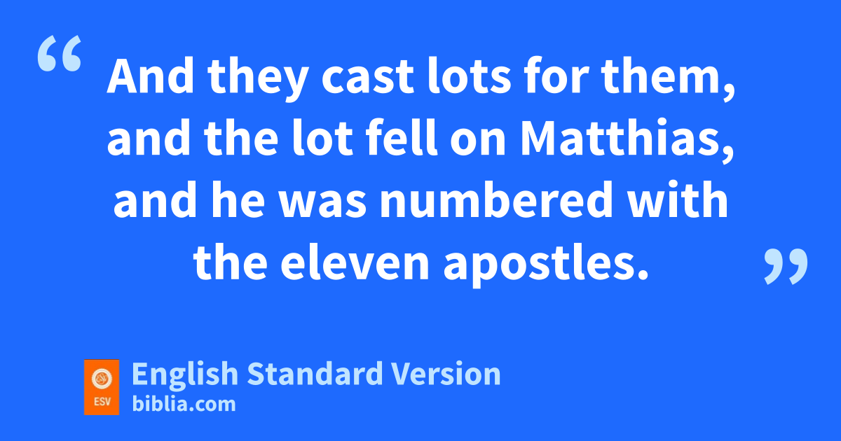 21 So one of the men who have accompanied us during tall the time that the Lord Jesus uwent in and out among us, 22 vbeginning from the baptism of John until the day when whe was taken up from us—one of these men must become with us xa witness to his resurrection.” 23 And they put forward two, Joseph called yBarsabbas, who was also called zJustus, and aMatthias. 24 And bthey prayed and said, “You, Lord, cwho know the hearts of all, show which one of these two you have chosen 25 to take the place in dthis ministry and eapostleship from which Judas turned aside to go to his own place.” 26 And they cast lots for them, and the lot fell on Matthias, and he was numbered with the eleven apostles.