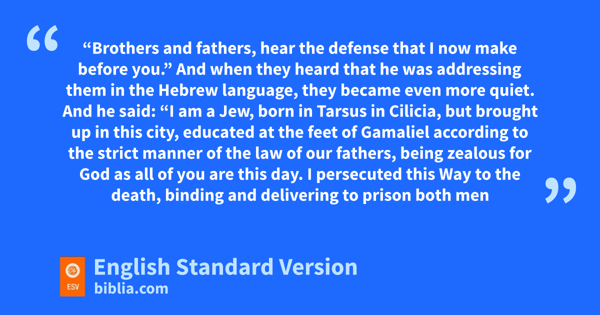 3 y“I am a Jew, born in Tarsus in Cilicia, but brought up in this city, educated zat the feet of aGamaliel2 baccording to the strict manner of the law of our fathers, cbeing zealous for God das all of you are this day. 4 eI persecuted fthis Way gto the death, binding and delivering to prison both men and women, 5 as hthe high priest and ithe whole council of elders can bear me witness. From them I received letters to jthe brothers, and I journeyed toward Damascus to take those also who were there and bring them in bonds to Jerusalem to be punished.