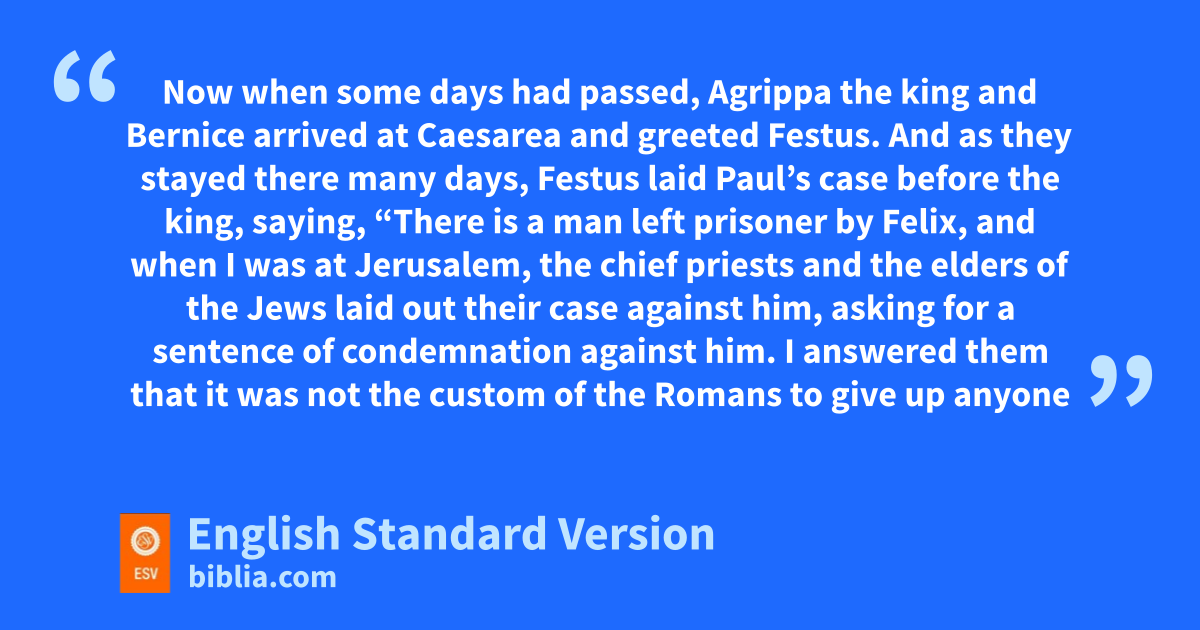 13 Now when some days had passed, Agrippa the king and Bernice arrived at Caesarea and greeted Festus. 14 And as they stayed there many days, Festus laid Paul’s case before the king, saying, t“There is a man left prisoner by Felix, 15 and when I was at Jerusalem, the chief priests and the elders of the Jews laid out their case uagainst him, asking for a sentence of condemnation against him. 16 vI answered them that it was not the custom of the Romans to give up anyone wbefore the accused met the accusers face to face and had opportunity to make his defense concerning the charge laid against him. 17 xSo when they came together here, I made no delay, but on the next day took my seat on ythe tribunal and ordered the man to be brought. 18 When the accusers stood up, they brought no charge in his case of such evils as I supposed. 19 Rather they zhad certain points of dispute with him about their own religion and about aa certain Jesus, who was dead, but whom Paul asserted to be alive. 20 Being at a loss how to investigate these questions, I basked whether he wanted to go to Jerusalem and be tried there regarding them. 21 But cwhen Paul had appealed to be kept in custody for the decision of dthe emperor, I ordered him to be held until I could send him to Caesar.” 22 Then eAgrippa said to Festus, “I would like to hear the man myself.” “Tomorrow,” said he, “you will hear him.”