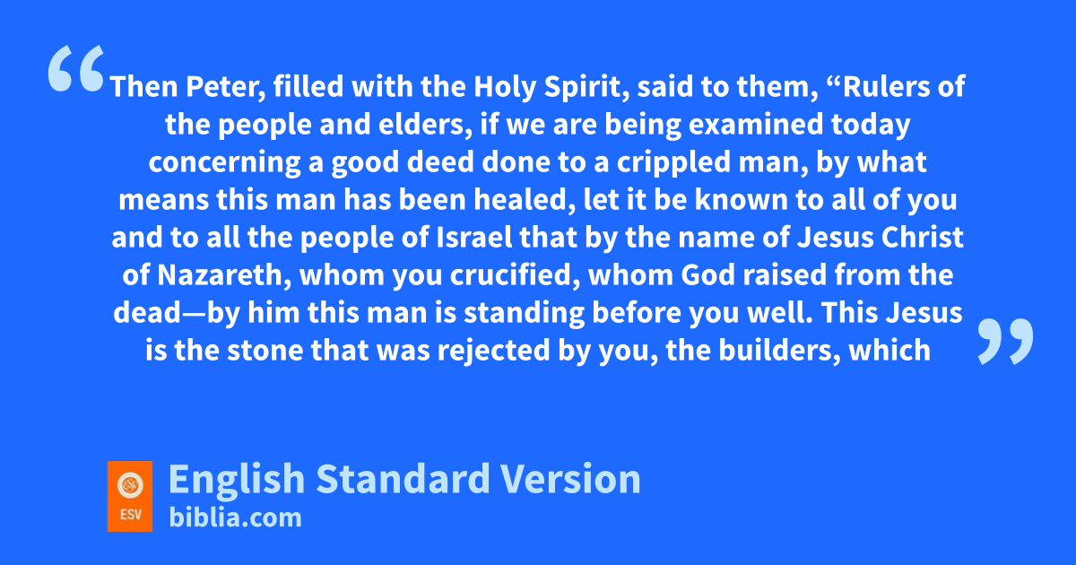 5 On the next day their rulers and elders and scribes gathered together in Jerusalem, 6 with qAnnas the high priest and rCaiaphas and John and Alexander, and all who were of the high-priestly family. 7 And when they had set them in the midst, they inquired, s“By what power or tby what name did you do this?” 8 Then Peter, ufilled with the Holy Spirit, said to them, “Rulers of the people and elders, 9 if we are being examined today vconcerning a good deed done to a crippled man, by what means this man has been healed, 10 let it be known to all of you and to all the people of Israel that wby the name of Jesus Christ of Nazareth, whom you crucified, xwhom God raised from the dead—by him this man is standing before you well. 11 yThis Jesus1 is the stone that was zrejected by you, the builders, which has become the cornerstone.2 12 And there is asalvation bin no one else, for cthere is no other dname under heaven given among men3 by which we must be saved.”