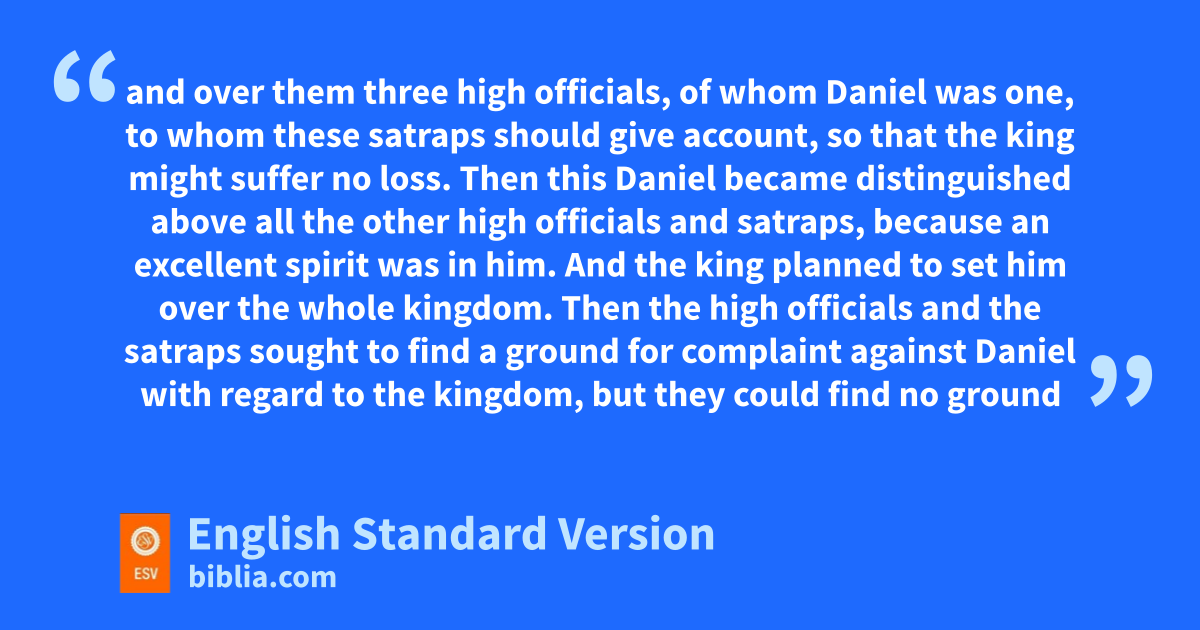 6 It pleased Darius to set over the kingdom q120 rsatraps, to be throughout the whole kingdom; 2 and over them sthree high officials, of whom Daniel was one, to whom these rsatraps should give account, so that the king might suffer no loss. 3 Then this Daniel became tdistinguished above all sthe other high officials and rsatraps, because uan excellent spirit was in him. And the king planned vto set him over the whole kingdom. 4 Then sthe high officials and rthe satraps wsought to find a ground for complaint against Daniel with regard to the kingdom, xbut they could find no ground for complaint or any fault, because he was faithful, xand no error or fault was found in him. 5 Then these men said, “We shall not find any ground for complaint against this Daniel unless we find it in connection with the law of his God.”