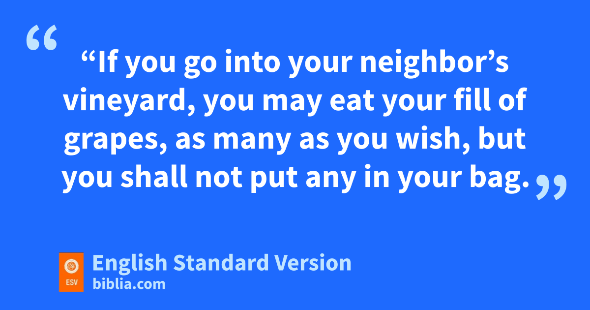 24 “If you go into your neighbor’s vineyard, you may eat your fill of grapes, as many as you wish, but you shall not put any in your bag. 25 If you go into your neighbor’s standing grain, dyou may pluck the ears with your hand, but you shall not put a sickle to your neighbor’s standing grain.