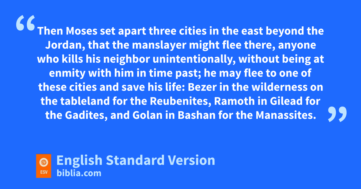 41 Then Moses mset apart three cities in the east beyond the Jordan, 42 that nthe manslayer might flee there, anyone who kills his neighbor unintentionally, without being at enmity with him in time past; he may flee to one of these cities and save his life: 43 oBezer in the wilderness on the ptableland for the Reubenites, Ramoth in Gilead for the Gadites, and Golan in Bashan for the Manassites.